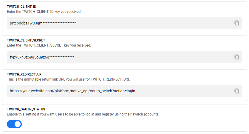 Add your credentials to the "TWITCH_CLIENT_ID and TWITCH_CLIENT_SECRET" fields on the Admin Control Center → Third-party login page.